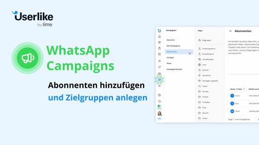 Bauen Sie Ihre WhatsApp-Empfängerliste auf, indem Sie Abonnenten hinzufügen. Dafür stehen Ihnen verschiedene Optionen zur Auswahl, zum Beispiel über einen QR-Code, den Sie direkt in Userlike erstellen können. Verwalten bzw. segmentieren Sie Ihre Empfänger anschließend in Zielgruppen, um noch gezieltere Kampagnen versenden zu können.
